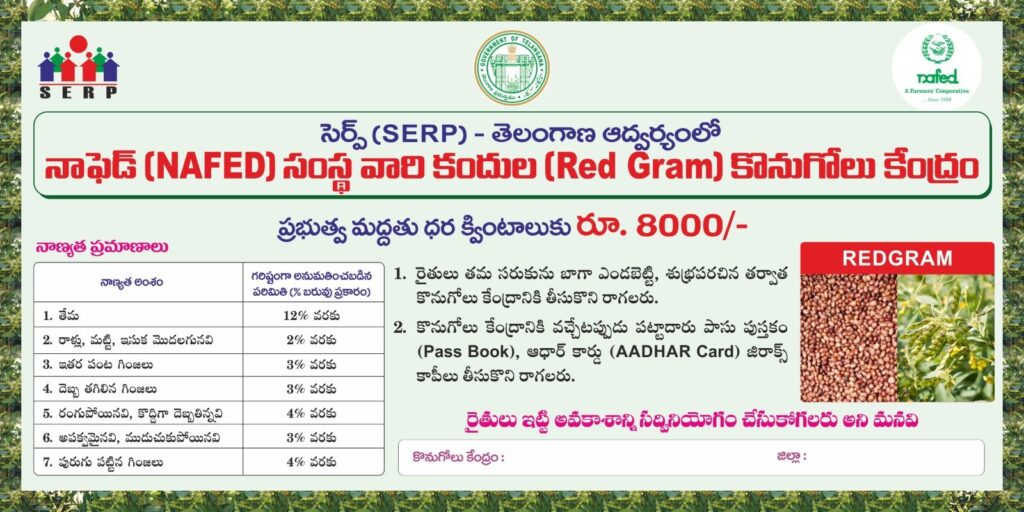 గండీడ్ మండలం FPC మహిళా రైతు ఉత్పత్తి దారుల సంఘం గండీడ్ ఐకెపి ఆధ్వర్యంలో కందుల కొనుగోలు కేంద్రం ప్రారంభించడం జరిగింది. NAFED సంస్థ వారి నుండి ప్రభుత్వ మద్దతు ధర క్వింటాల్ (A గ్రేడ్) రు ₹8000 రూపాయలుగా నిర్ణయించడం జరిగింది.