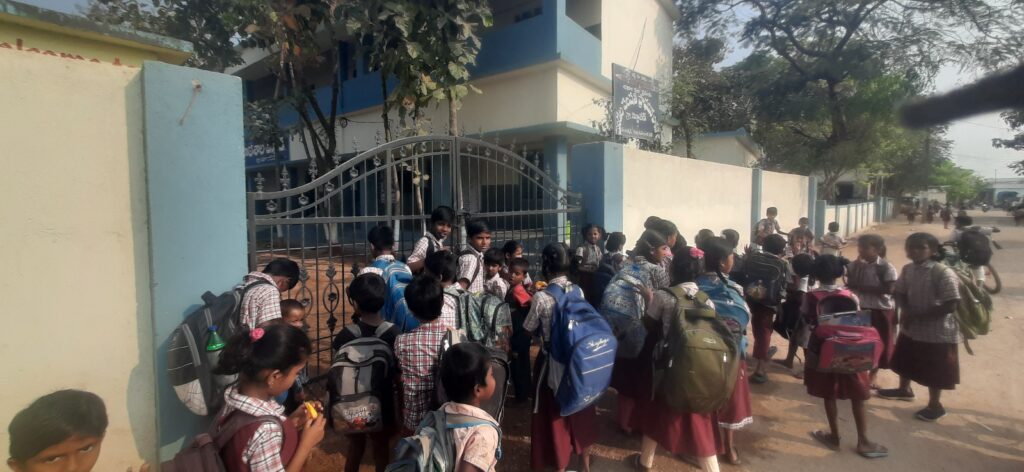 స్కూలు బయట వేచి ఉన్న విద్యార్థులు