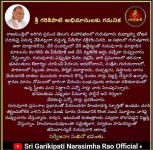 గురువు గారు ఎప్పుడు పేదల పక్షమేనని.. భగవంతుడు ఎప్పుడూ పేదవాళ్ళ పార్టీనే అని గర్వంగా వేదికలపై గరికపాటి ఎన్నోసార్లు ప్రకటించారని ఆయన టీం గుర్తుచేసింది. గరికపాటి ప్రసంగాల ప్రభావంతో పేదలందరూ హిందూ ధర్మ స్పూర్తితో ఉండటం చూసి జీర్ణించుకోలేక వారిని పేదల నుంచి దూరం చేయడానికి కొంత మంది మూర్ఖులు వారిపై దుష్ప్రచారం చేస్తున్నారని ఆయన టీం చెప్పుకొచ్చింది. ఇటువంటి కుతంత్రాలకు
