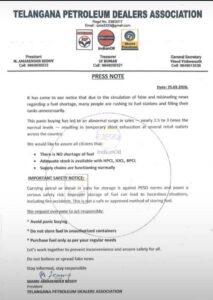 ‘నో స్టాక్’ బోర్డులతో ఆందోళన “రాష్ట్రంలో ఇంధన కొరత ఉందనే వార్తల్లోఏ మాత్రం నిజం లేదు. హెచ్పీసీఎల్, ఐఓసీఎల్, బీపీసీఎల్ వద్ద రాష్ట్ర అవసరాలకు సరిపడా నిల్వలు ఉన్నాయి. సరఫరా వ్యవస్థ సాధారణంగానే ఉంది” అని పెట్రోలియం డీలర్స్ అసోసియేషన్ ఒక ప్రకటనలో తెలిపింది. అధిక రద్దీ కారణంగా కొన్ని పెట్రోల్ బంకుల్లో నిల్వలు త్వరగా ఖాళీ కావడంతో ‘నో స్టాక్’బోర్డులు దర్శనమిచ్చాయి. అయితే, ఇది తాత్కాలిక పరిస్థితి మాత్రమేనని అధికారులు స్పష్టం చేస్తున్నారు. డిపోల నుంచి ట్యాంకర్లు చేరుకునే వరకు మాత్రమే ఈ అంతరాయం ఉంటుందని తెలిపారు.